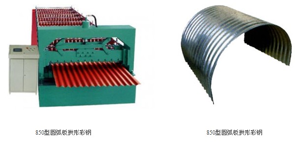 850型圓弧板拱形彩鋼機(jī)可根據(jù)生產(chǎn)需要生產(chǎn)各種不同外觀的屋面板,且成品率高。